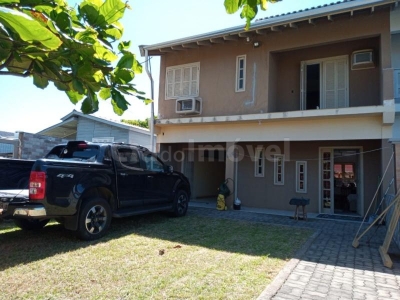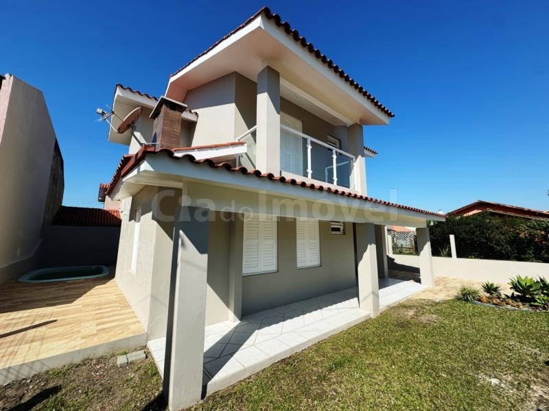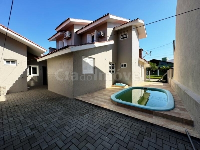 Sobrado com 160m² de alvenaria, com piscina, composta por 03 dormitórios, sendo 01 suíte com sala de estar com lareira, sala de jantar, cozinha com despensa, 2 lavabos, banheiro social, garagem fechada com churrasqueira.