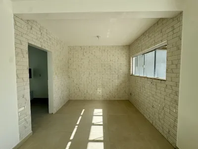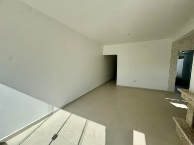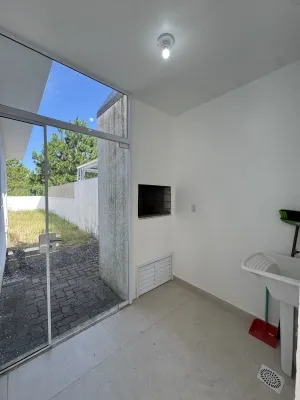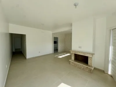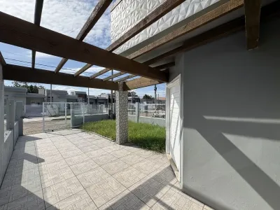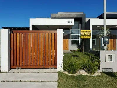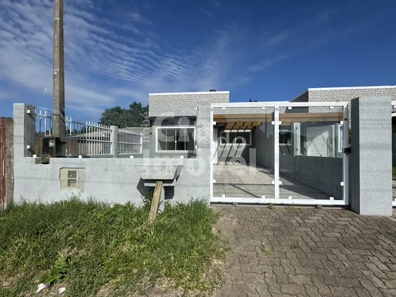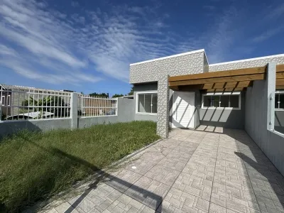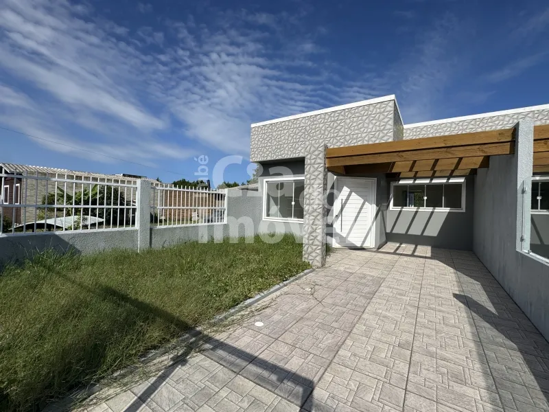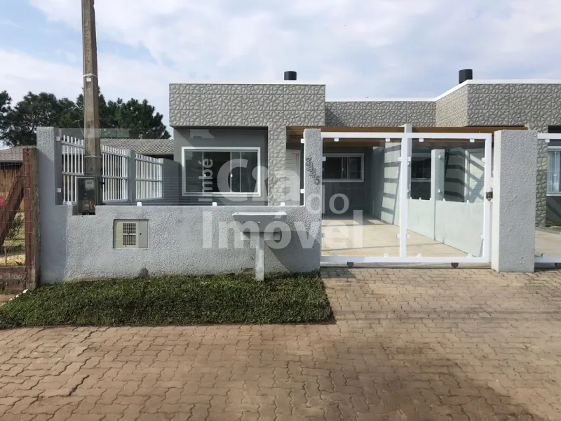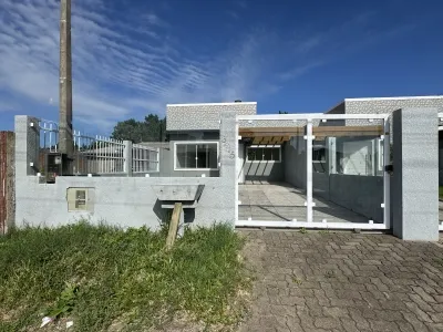 Geminada com aproximadamente 70m², composta 02 dormitórios, sala de estar com lareira integrada a sala de jantar e cozinha, banheiro social, laje de concreto (com possibilidade para construção de 2º piso), área de serviço e churrasqueira. Pátio na frente e fundos, pergolado, abrigo para carro.