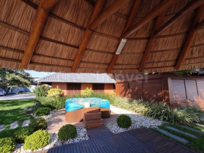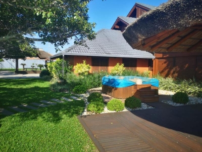 Lindo terreno gramado, possuindo quiosque, área para festas com churrasqueira, jacuzzi e quadra esportiva.
