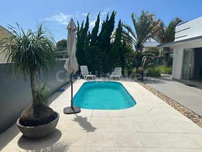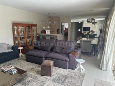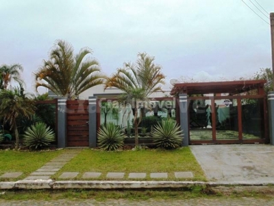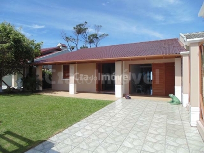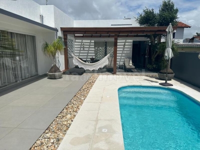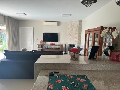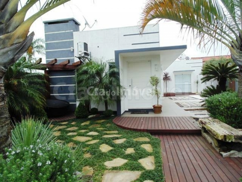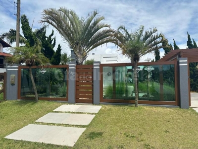 Casa em laje de concreto finamente mobiliada, com 03 dormitórios, sendo 01 suíte, sala e cozinha integradas, lareira, área de serviço, churrasqueira, piscina, jardim com lindo paisagismo, designer moderno.